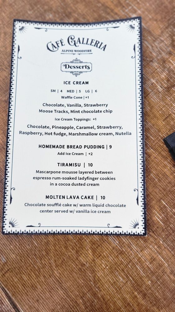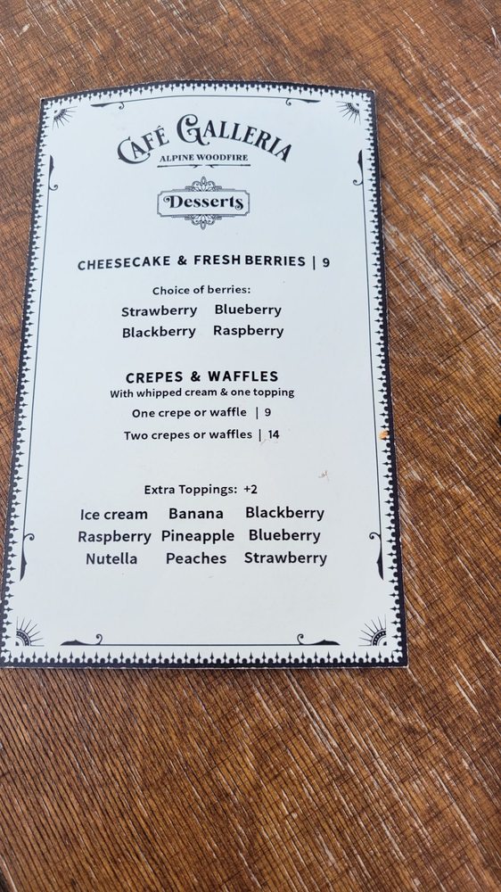 Café Galleria, located in Midway, UT, offers a unique dining experience with its alpenglobes for private dining. The menu features a variety of Italian-inspired dishes, including salads, pizzas, pasta, and desserts. Customers rave about the flavorful special sauce on the pasta and the delicious mushroom pizza. The restaurant also caters to different dietary preferences, offering vegan options and gluten-free crust for pizzas. The ambiance is cozy and inviting, with old inspiring photos adorning the walls. The attentive service and cost-friendly menu make it a popular choice for families and groups. Overall, Café Galleria provides a memorable dining experience with its tasty food, charming atmosphere, and personalized service.